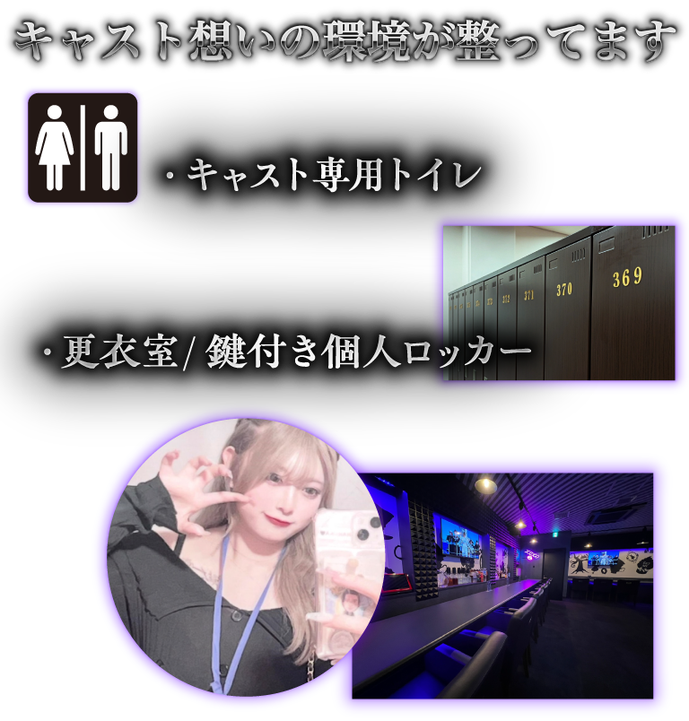 更衣室はもちろん、鍵付きの個人ロッカー・キャスト専用トイレなど・・・